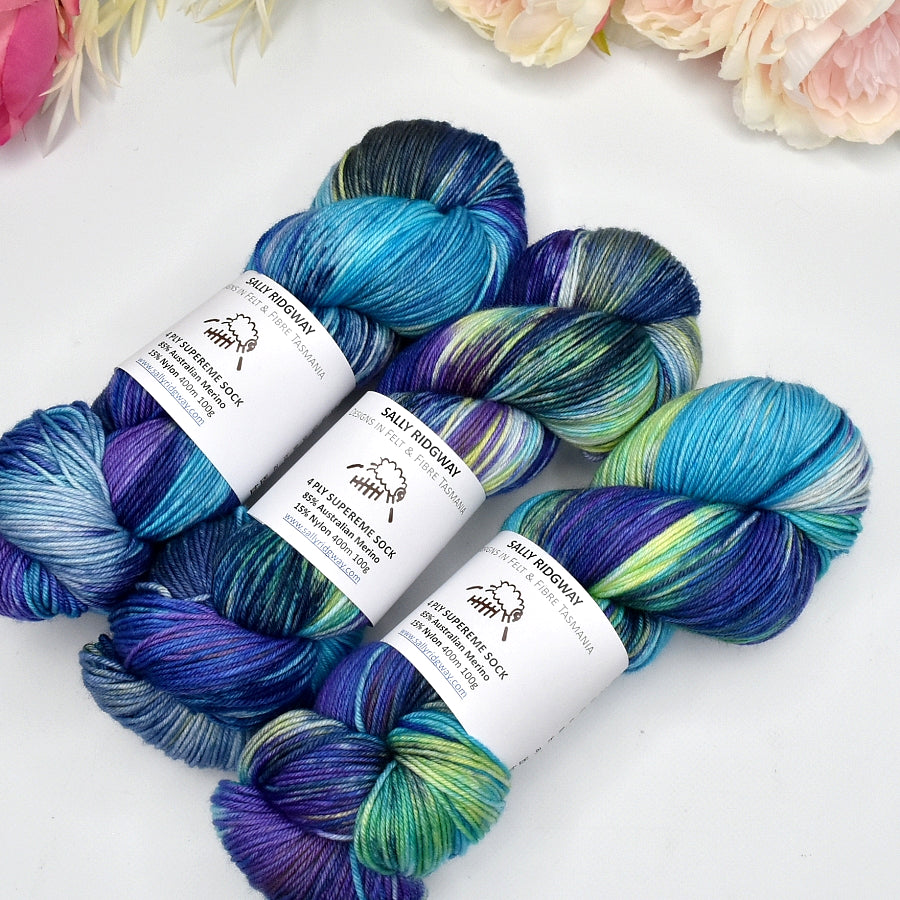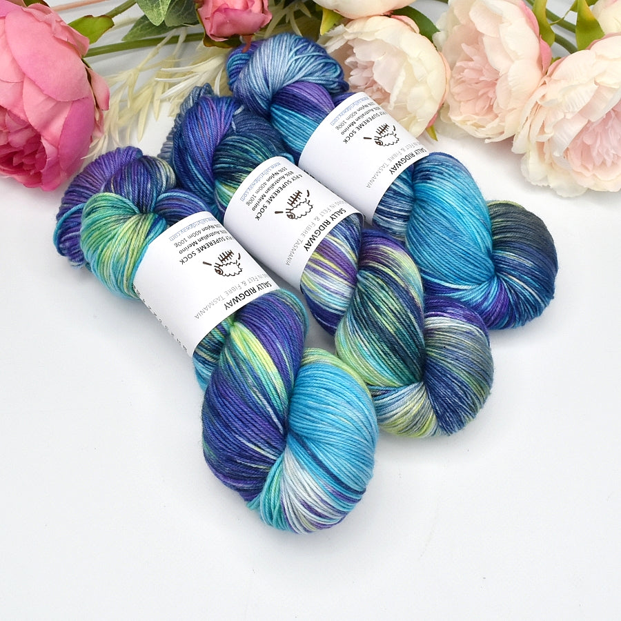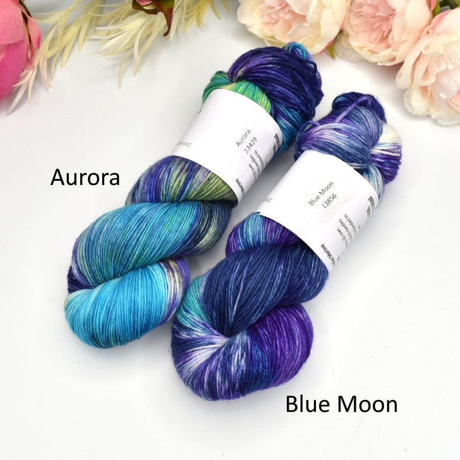 Aurora is a bright happy sock yarn for those who like their colours bold. With a random combination of yellow, blues and purple, these colours all blend to give a fun yarn that will knit into some out there socks!