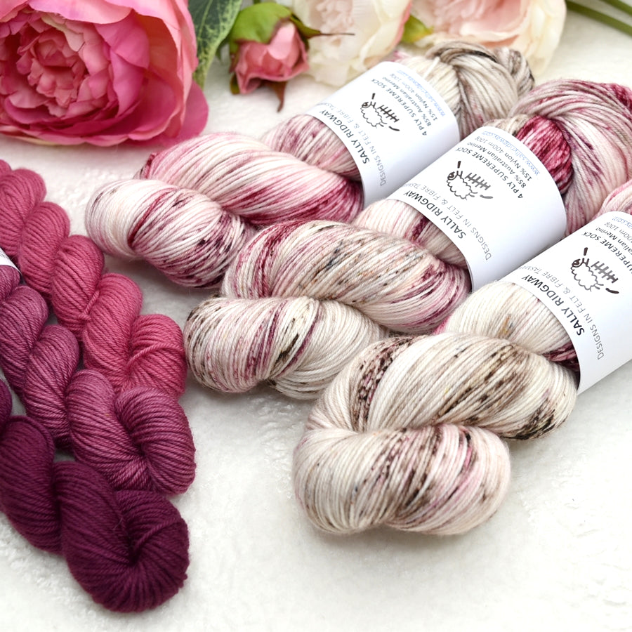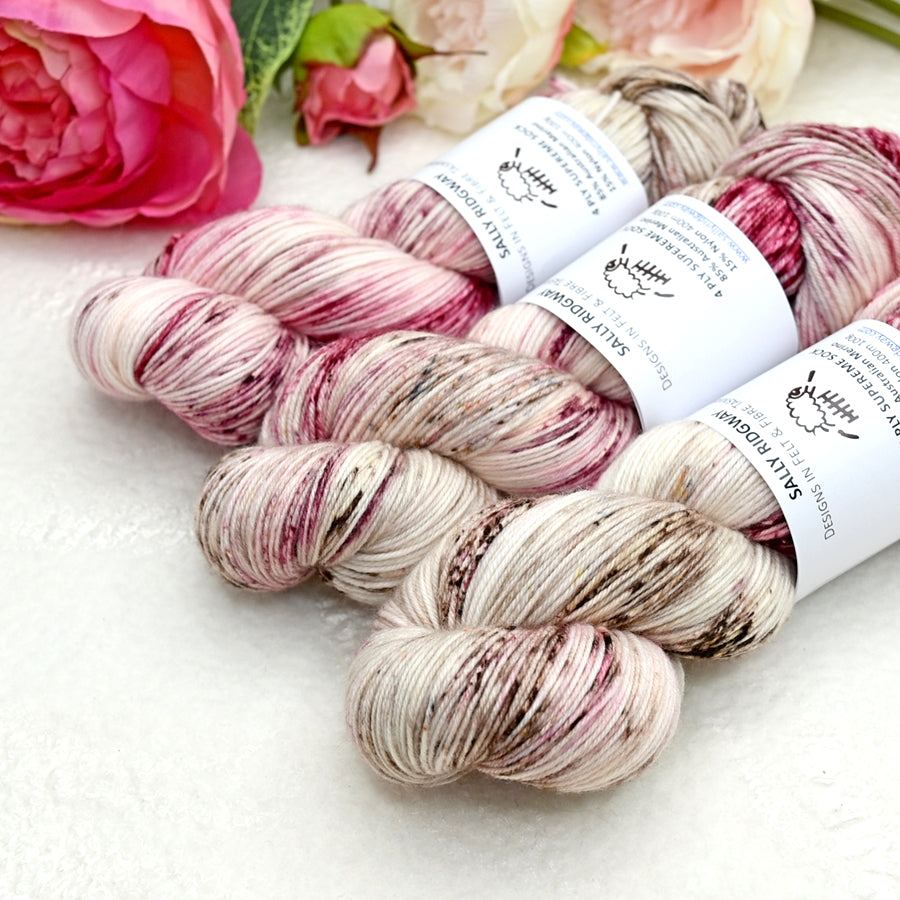 Cherry Bon Bon is a fun speckled combination of rich crimsons, pinks and chocolate all combining into this lovely colourway. This would look stunning knitted up into a shawl or cowl.