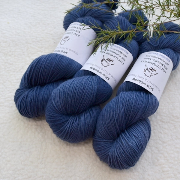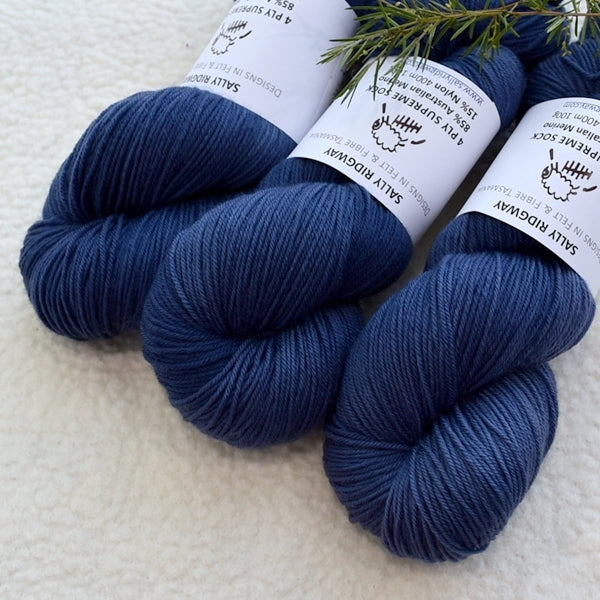 Supreme Sock 4 Ply Australian Merino wool knitting yarn, hand dyed in a strong shade of Navy Steel Blue creating a bold semi solid colourway with some variations in shade throughout.