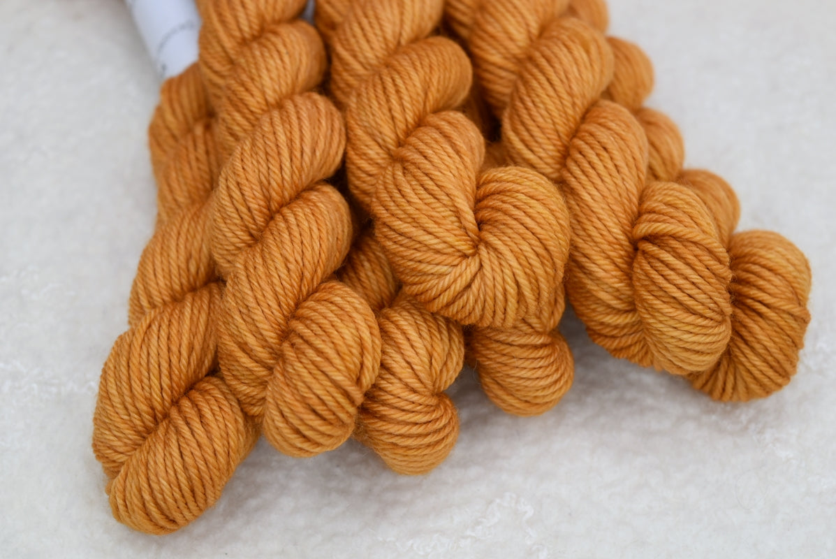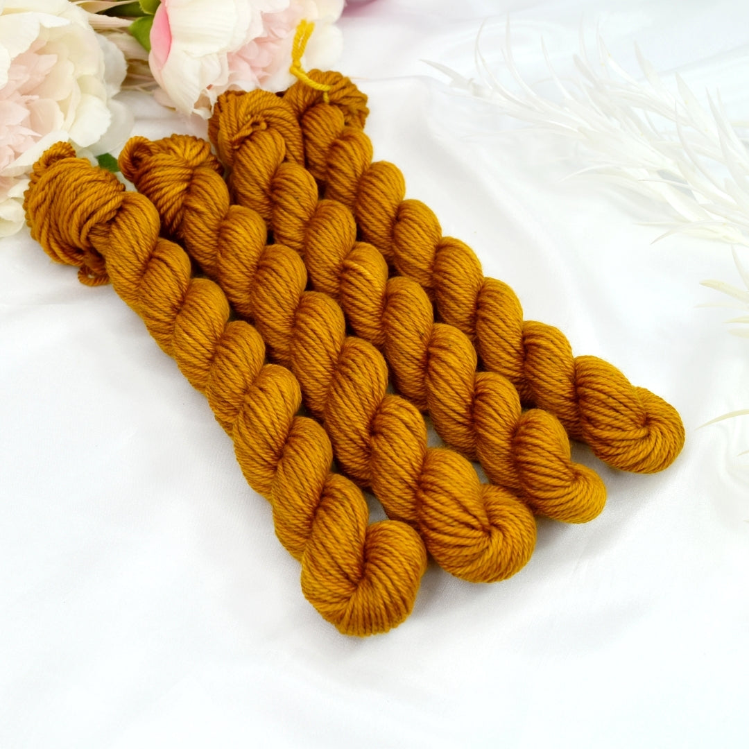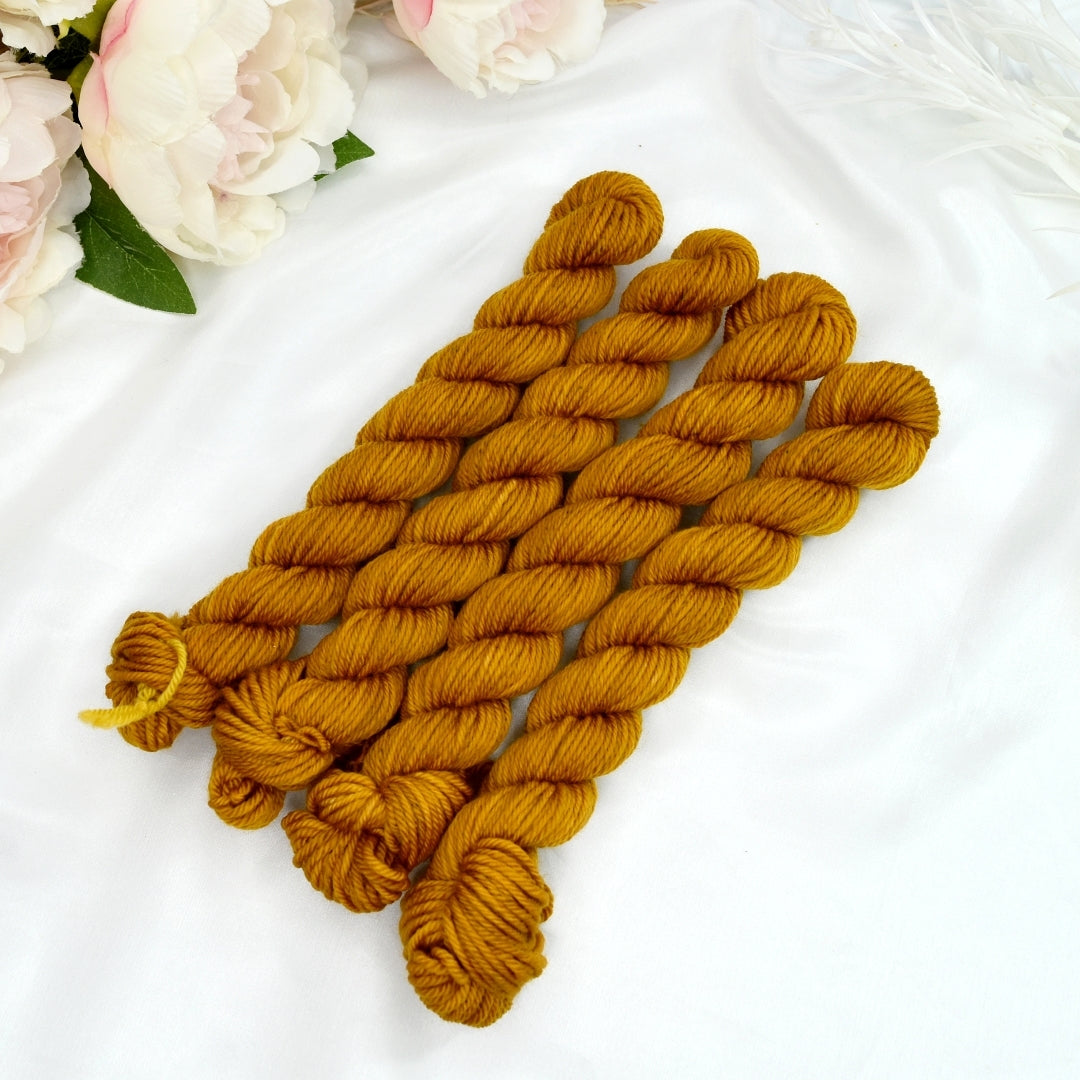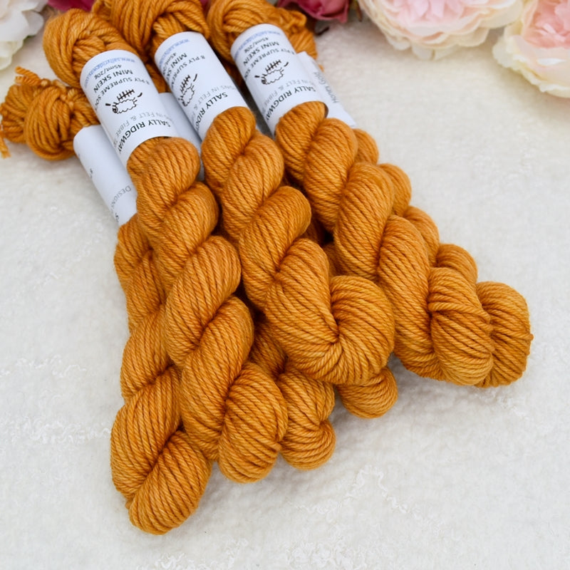 These popular little 8 ply or DK weight mini skeins are perfect to add a little colour to your projects. They compliment my 8 Ply Supreme Sock base perfectly as they are the same merino nylon mix of 85% merino and 15% nylon.