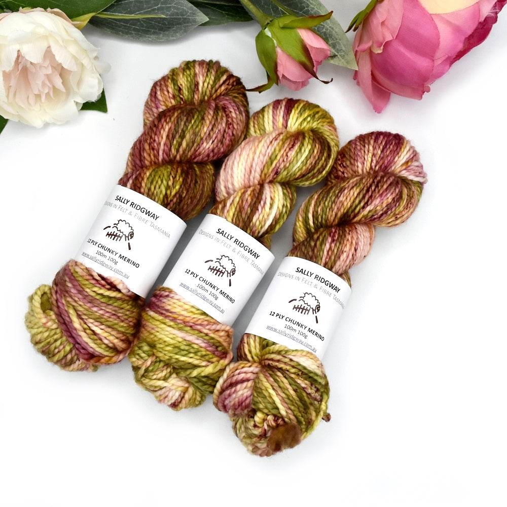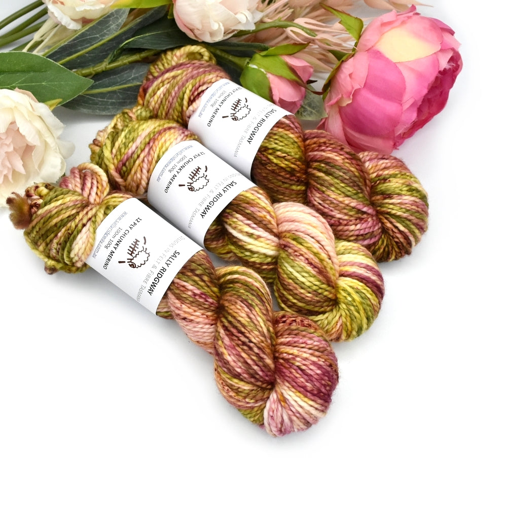 Chintz Bouquet is a regular colour and has a lovely mossy green, soft pink and crimson through out the hanks.
