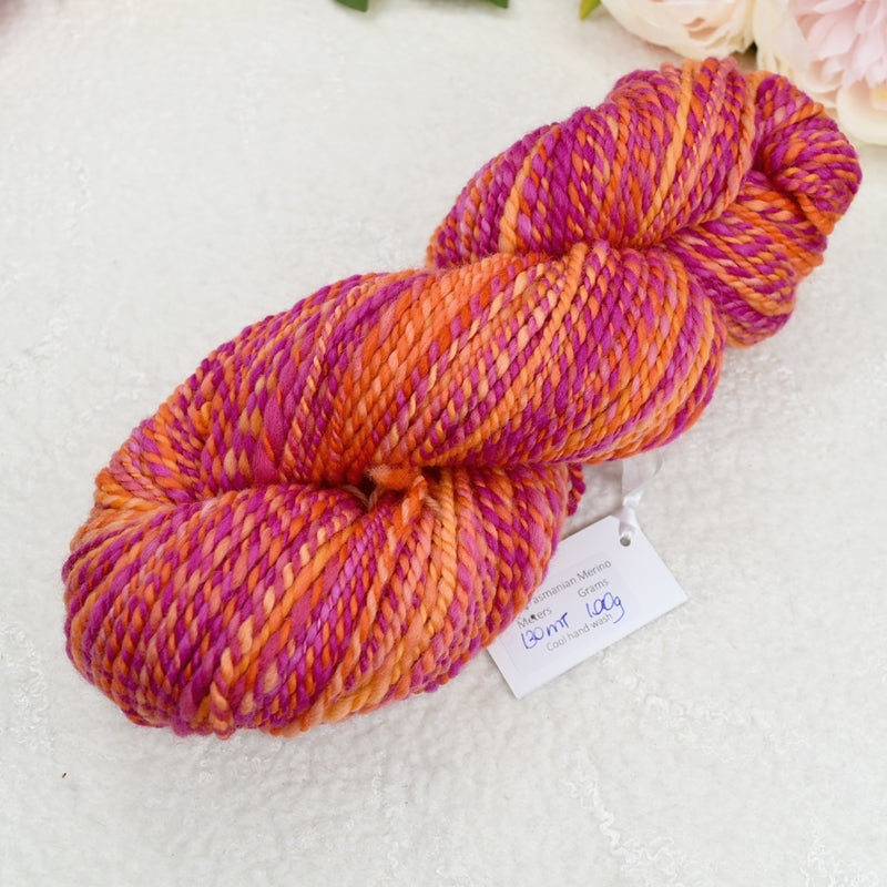 This chunky little handspun is a standard 2 ply spin using Australian grown and processed Corriedale wool that I have hand dyed and then spun.