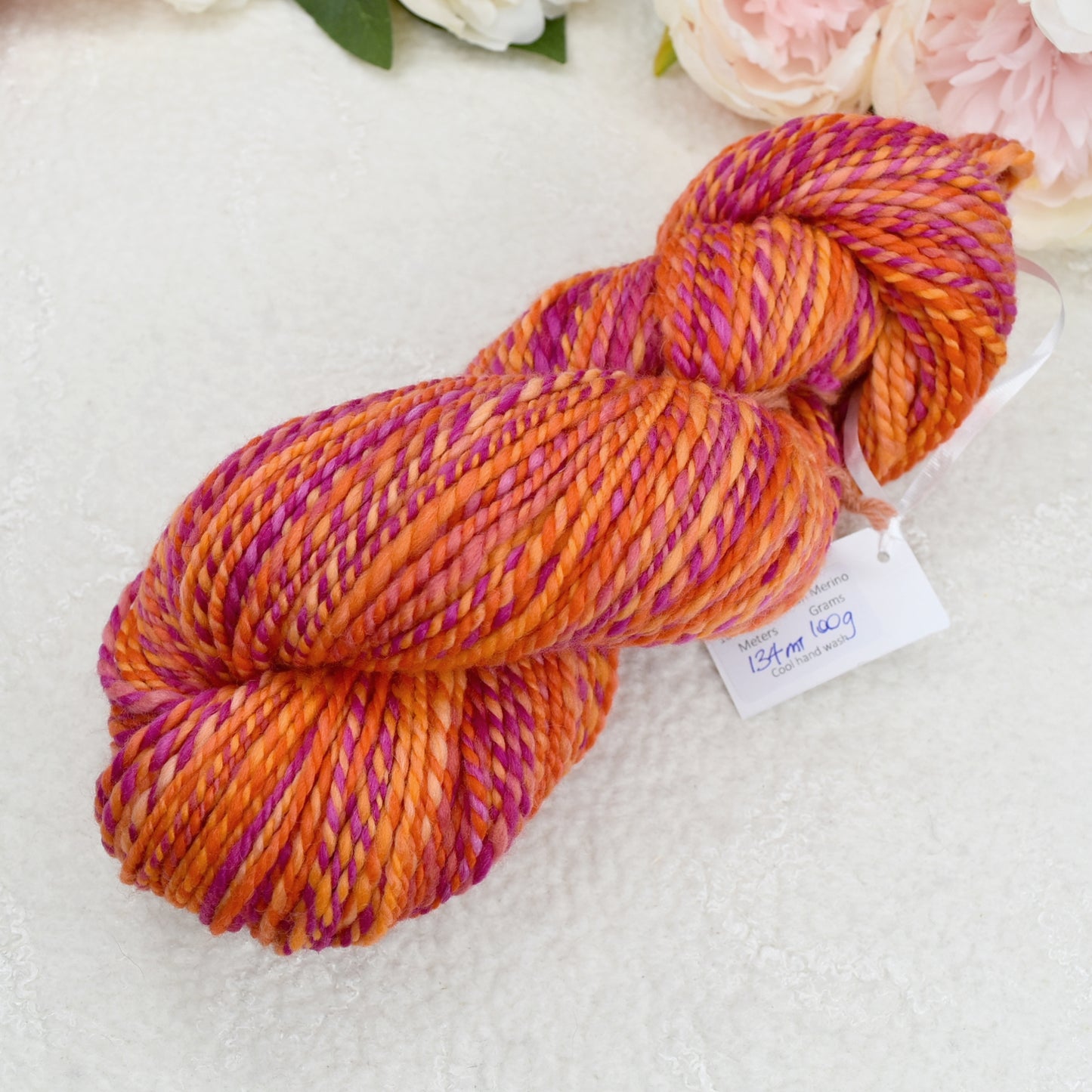 Blood Orange is a strong orange and crimson colourway that spun into these bright yarns. I spin with plenty of texture and variation through the skeins adding texture and life to you knitted fabric.