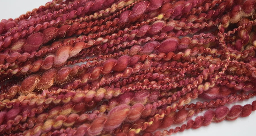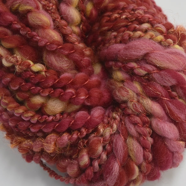 Spun from a hand carded art batt thick & thin 2 ply then I have plied it all together with a hand dyed silk yarn. Add some other yarns to make this skein go further and ad even more interest to a beautiful scarf or shawl.