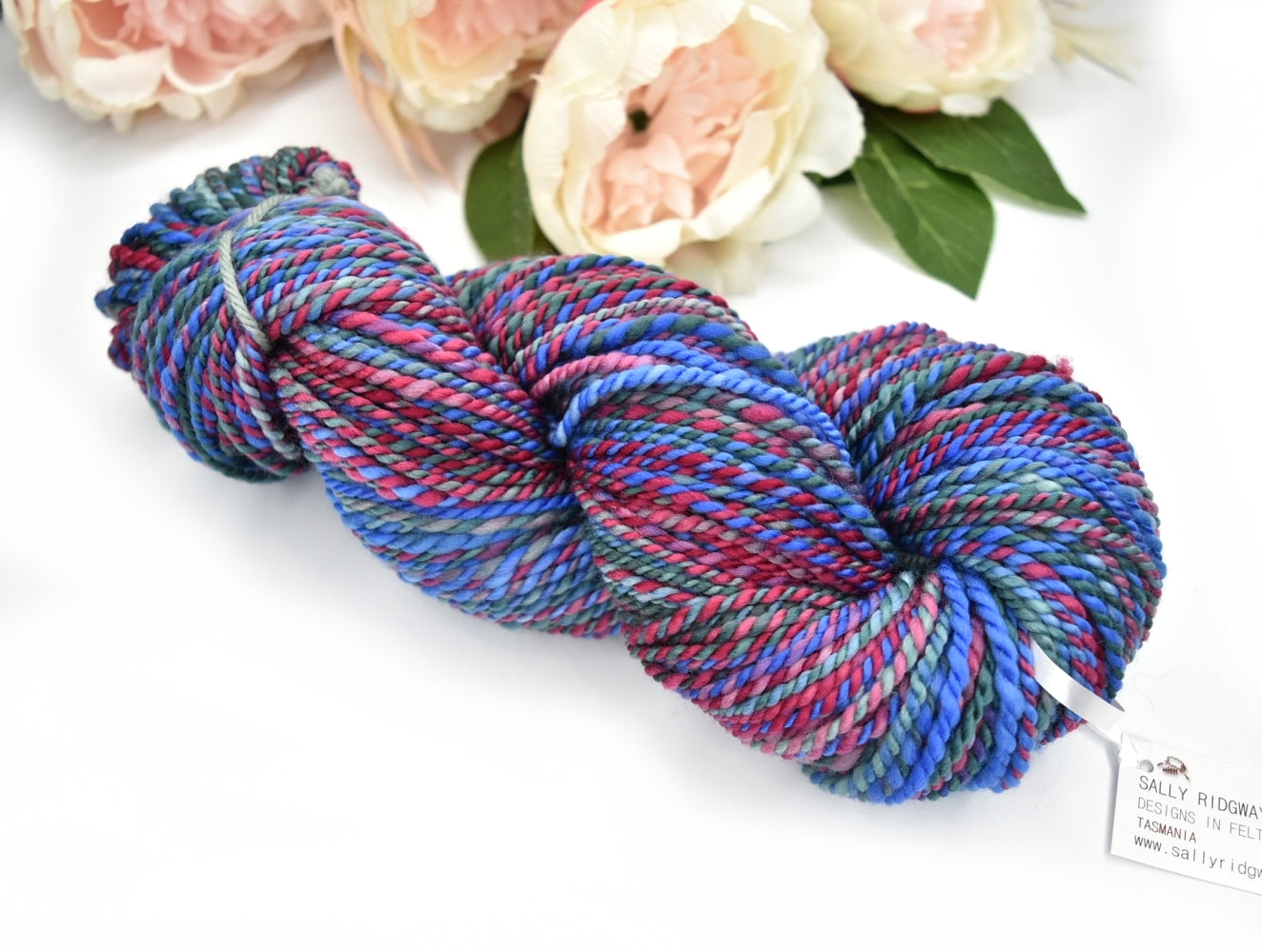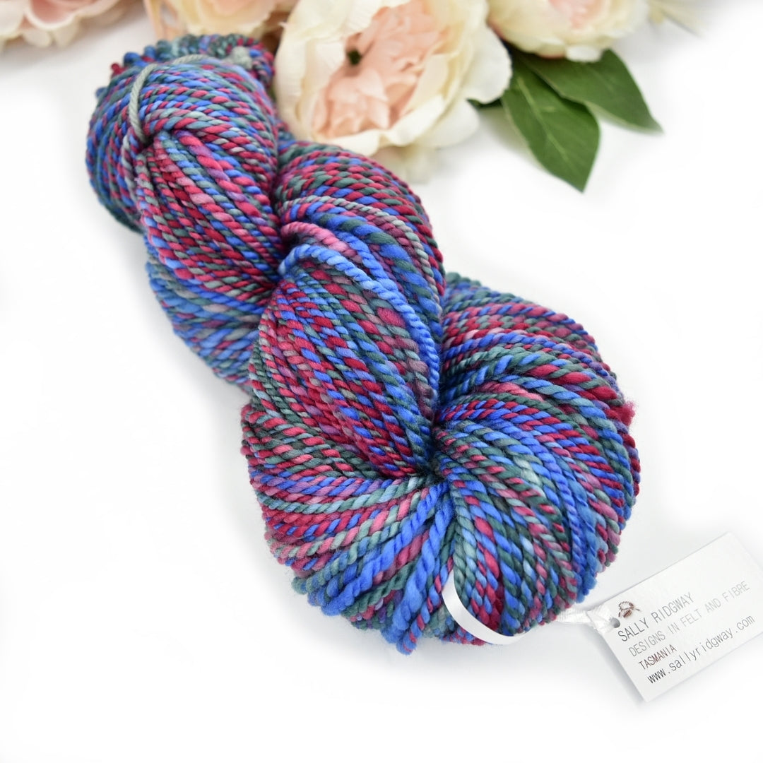 This pretty red blue and green coloured hand spun yarn is spun from my hand dyed superwash merino wool and is my standard 2ply spin. It sits at about 8 WPI which is around Aran weight.