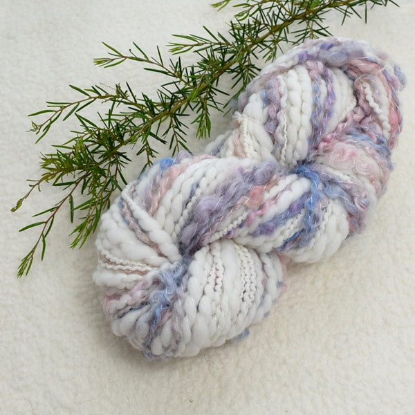 This light and pretty yarn is created and designed using my hand dyed Tasmanian Merino wool and English Leicester lamb locks just peeping through. Carded and spun from one of my art batts