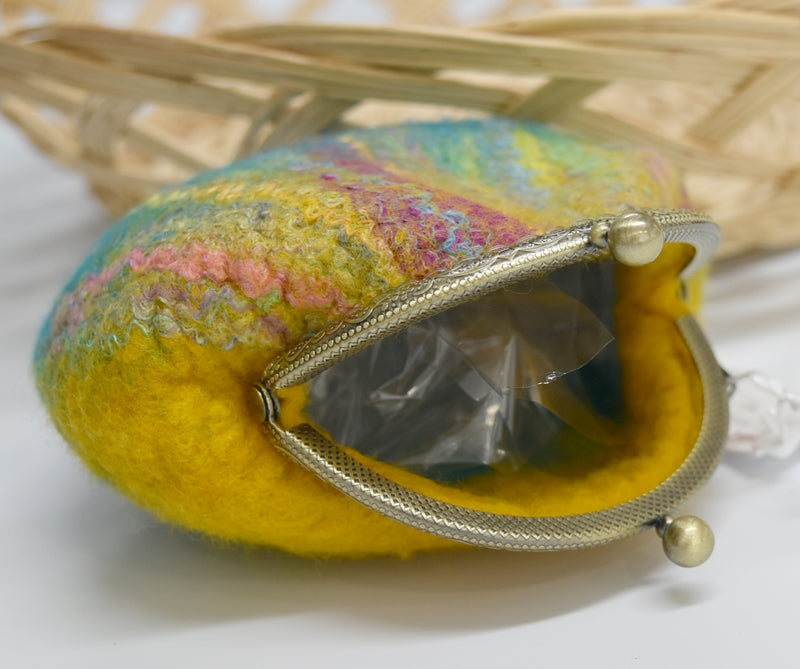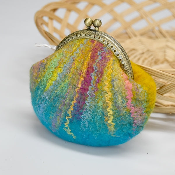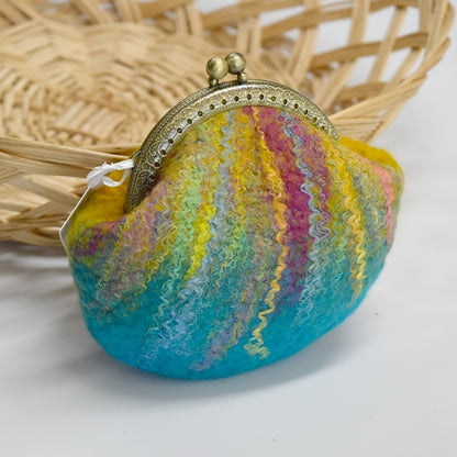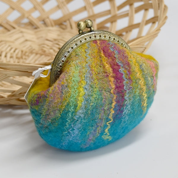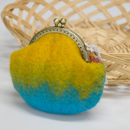 This hand made wool felt coin purse is in shades of blue and yellow with Mulberry silk details down the front