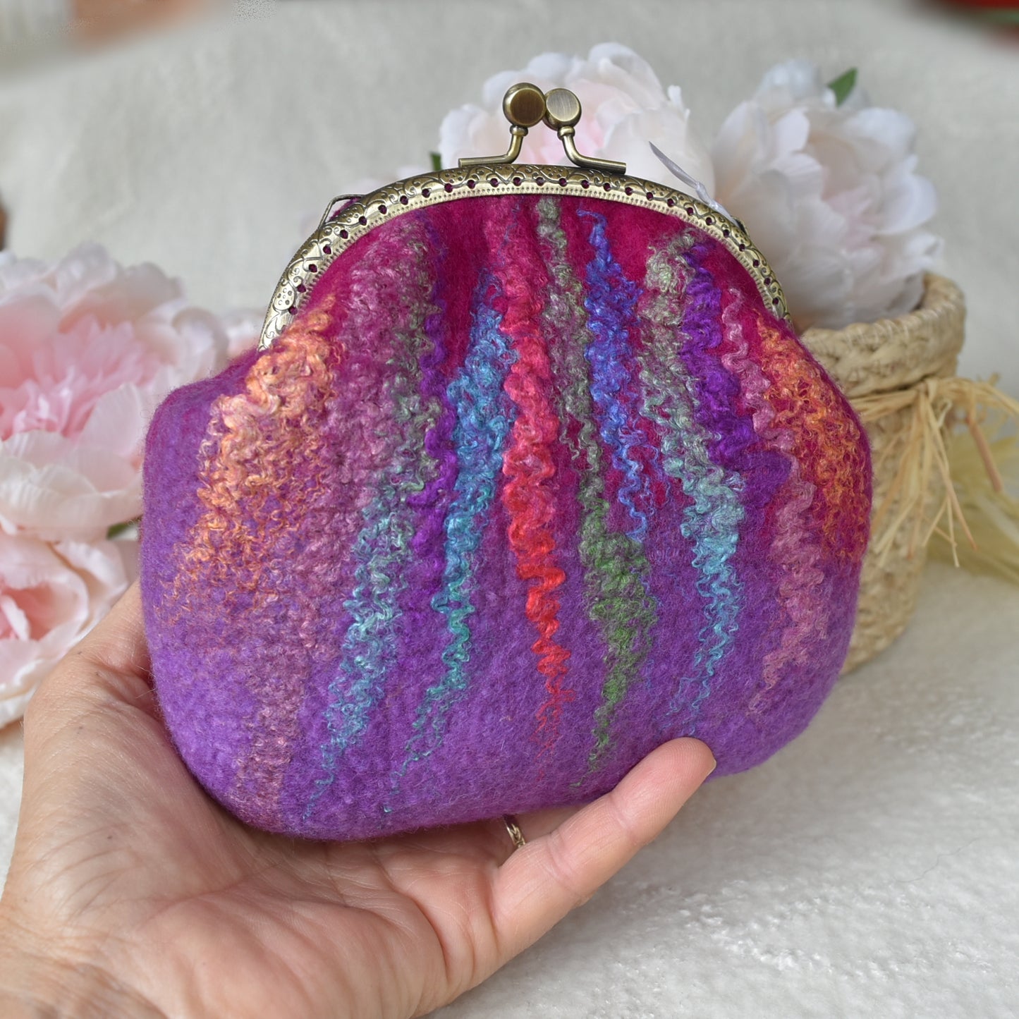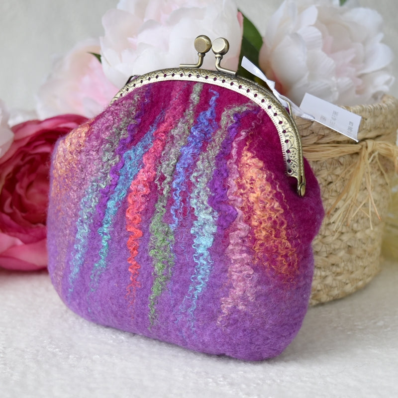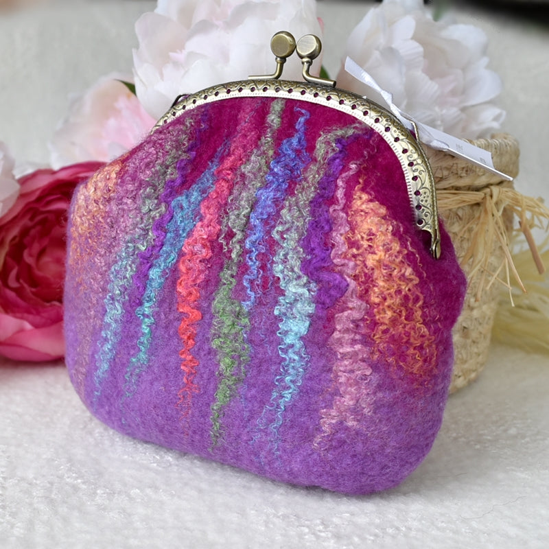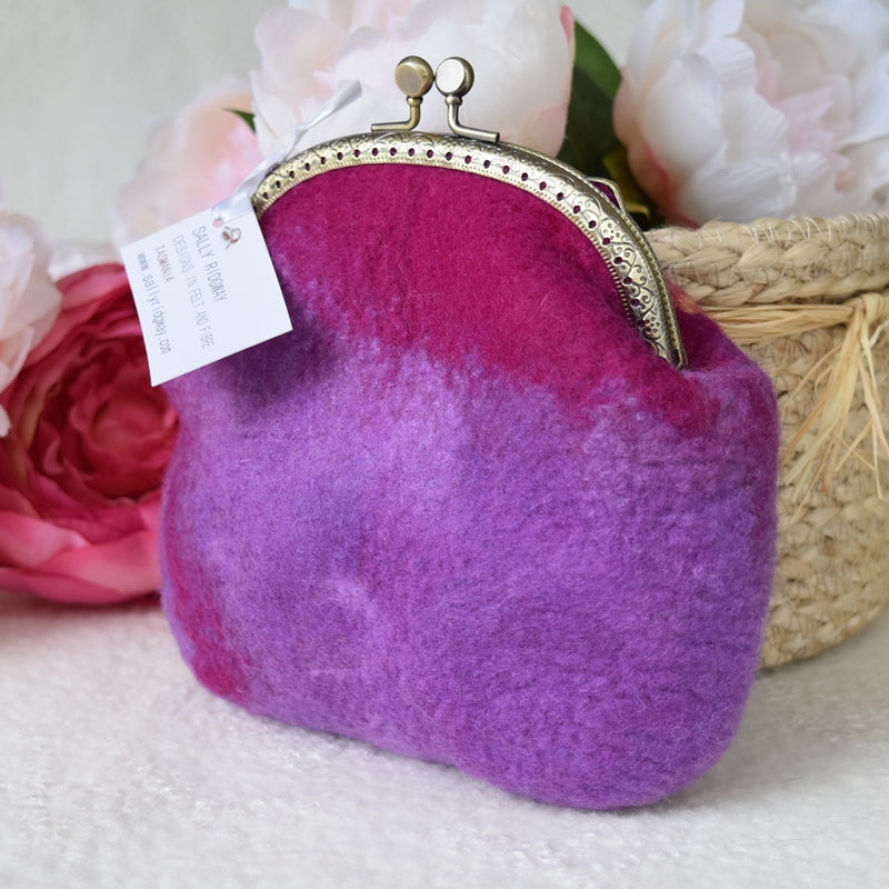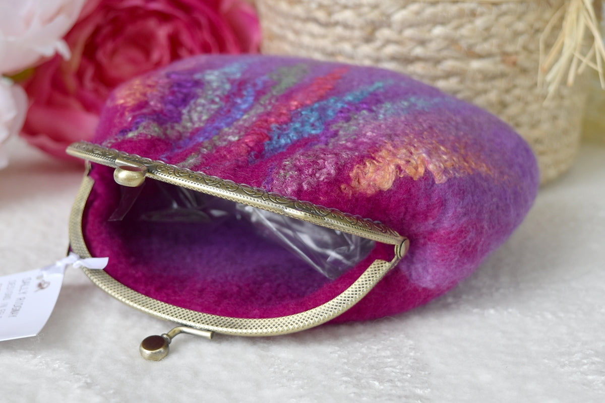 This larger crimson pink and purple wool felted purse has hand dyed silk fibre felted into the front creating a variegated multi colour to base and has a 11.5 cm brass look kiss lock frame.
