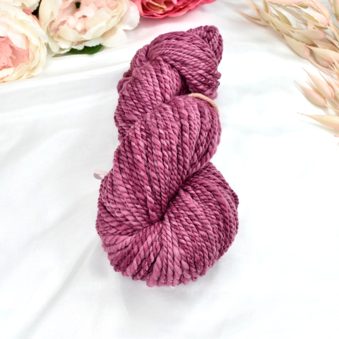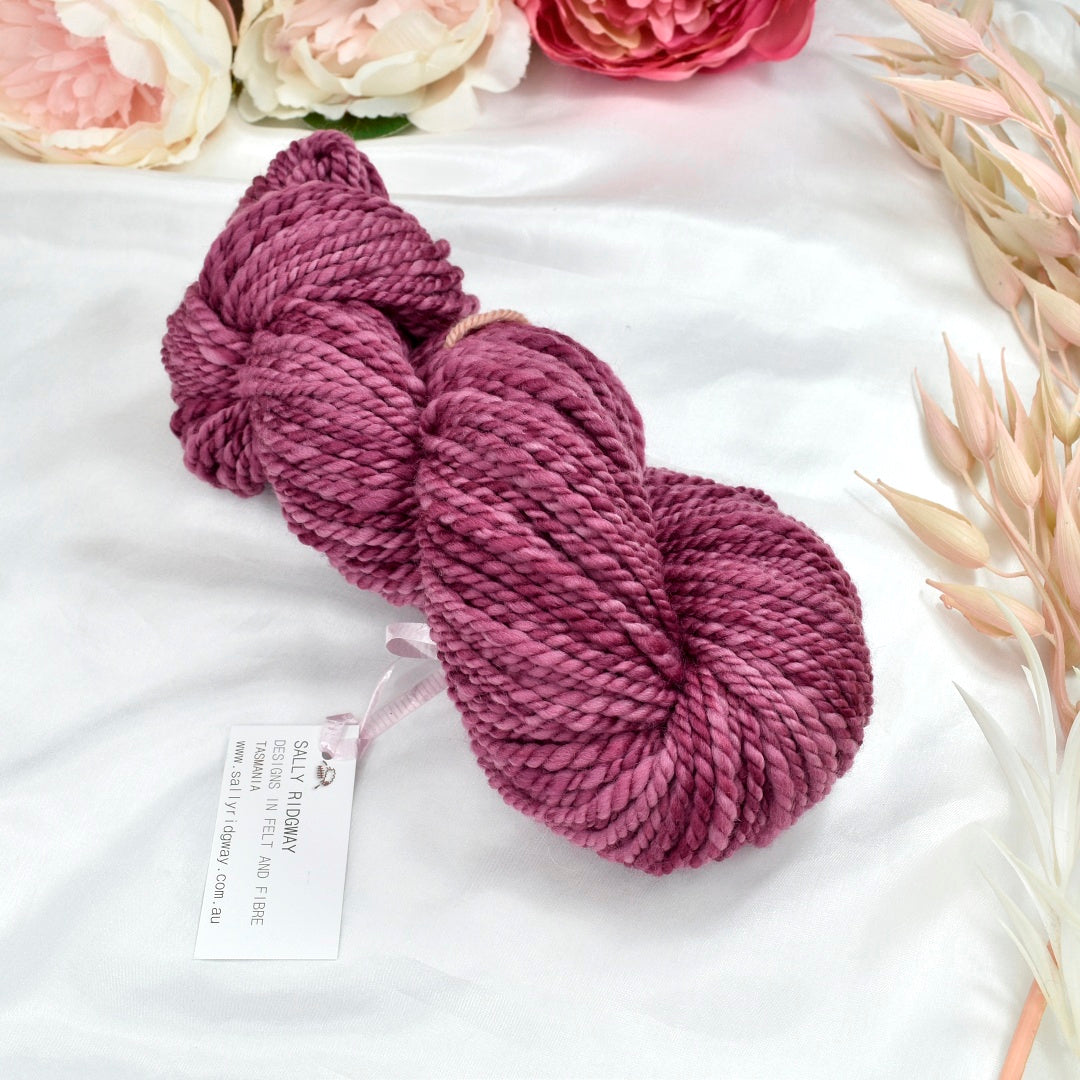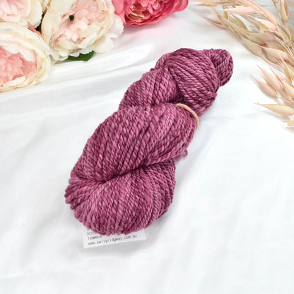 Wine O'clock is a soft smoky pink with plenty of variation in the hank. This one has been spun from one pack of our hand dyed Wine O'clock Tasmanian Merino wool tops.