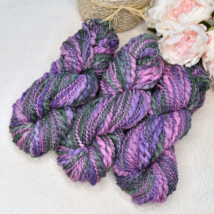 These thick and thin hand spun yarns are soft and squishy, in shades of lavender, aubergine and green.