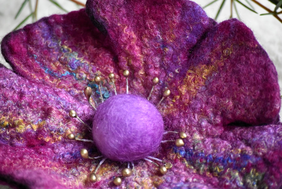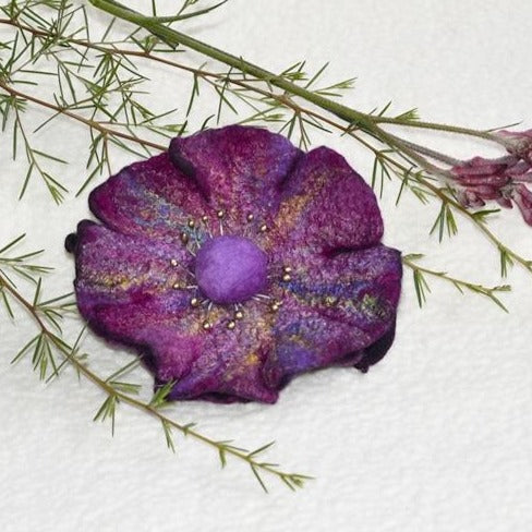 I make these pretty wool felt flower brooch pins from my hand dyed Australian merino wool and silk fibres.