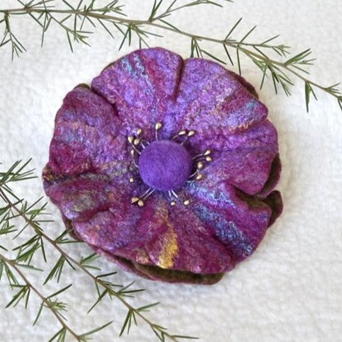 I make these pretty wool felt flower brooch pins from my hand dyed Australian merino wool and silk fibres.