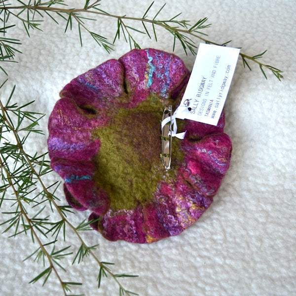 This pretty one is in crimson pink and olive green shades of wool felt with rainbow coloured mulberry silk fibres felted into the front and a silver pin stitched off centre on the back.