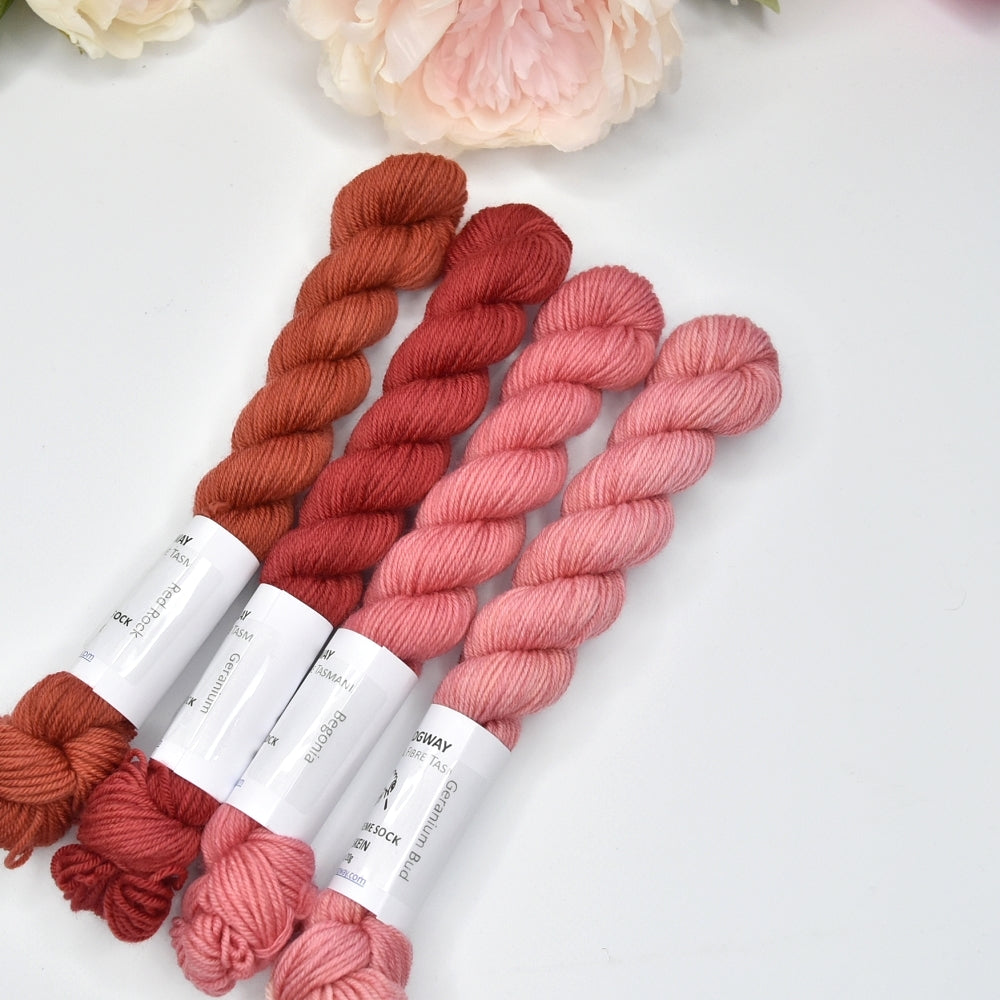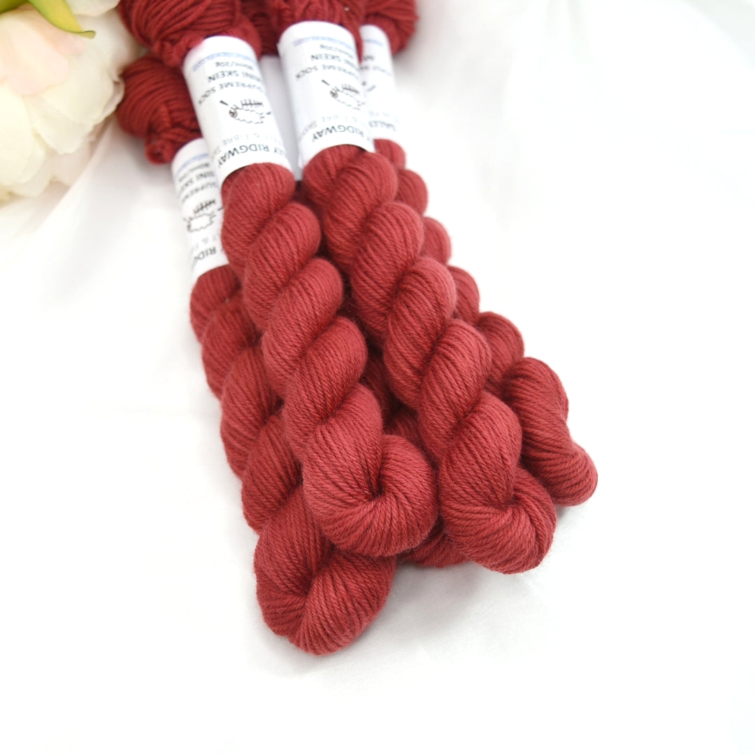 Geranium mini skeins are in a strong semi solid Christmas red shade. This is a stronger shade of Geranium Bud