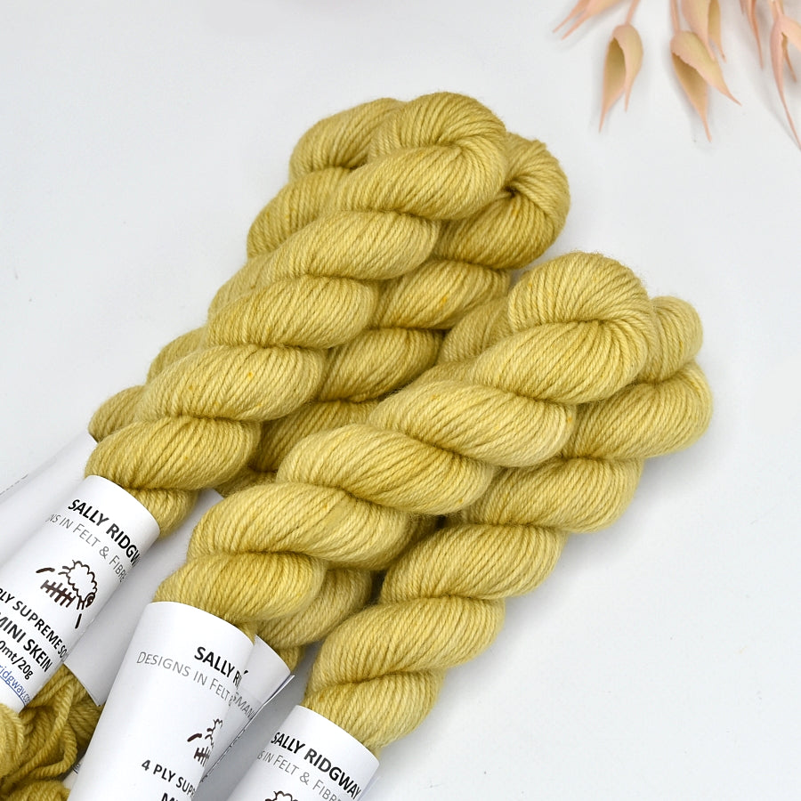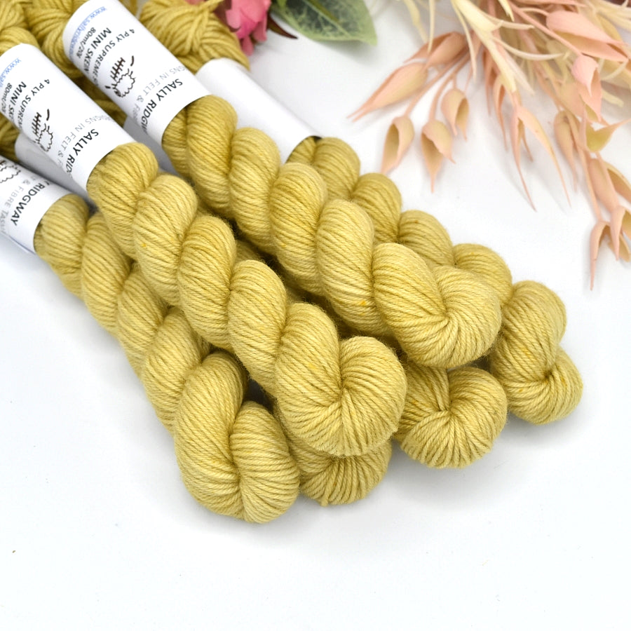 Asparagus mini skeins are in a pretty faded yellow semi solid colourway with slight variations of shade throughout.