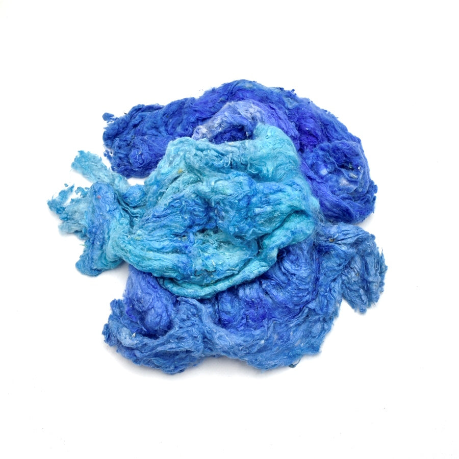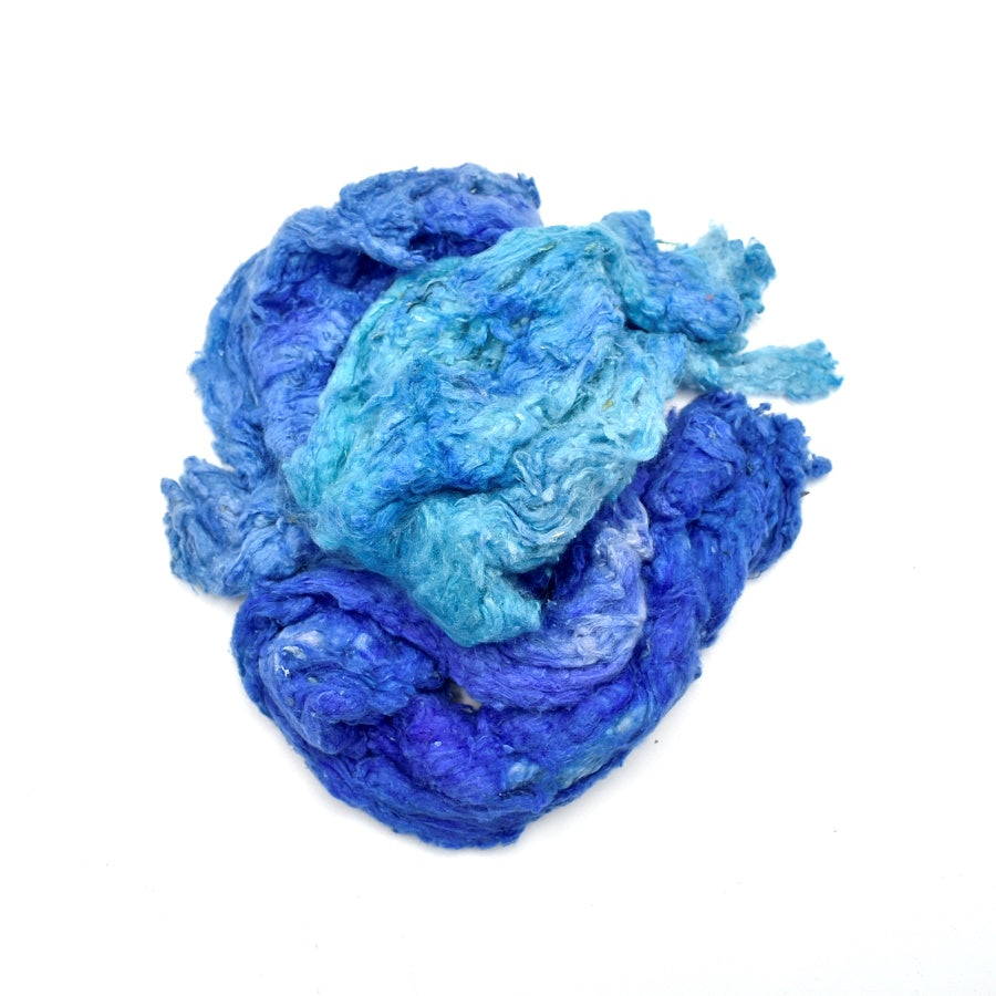 Mulberry Silk Noil Fibre Hand Dyed in a bright rich tropical blue combination. The left over fibres of the silk carding process are called silk noil, these can then be used to add texture to hand spun yarns, felting projects, art batts etc. This is a very short fibre.