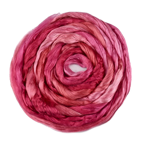 Mulberry Silk Roving Hand Dyed in a lovely pink with soft subtle undertones of apricot to add variation and depth to this bright colourway.