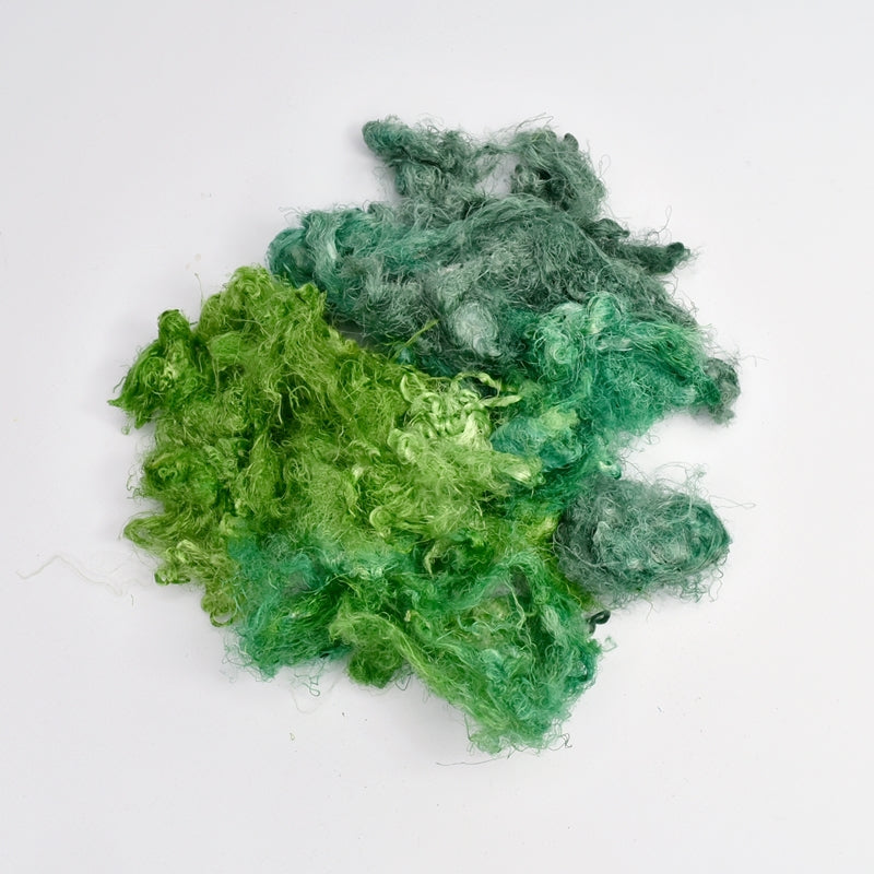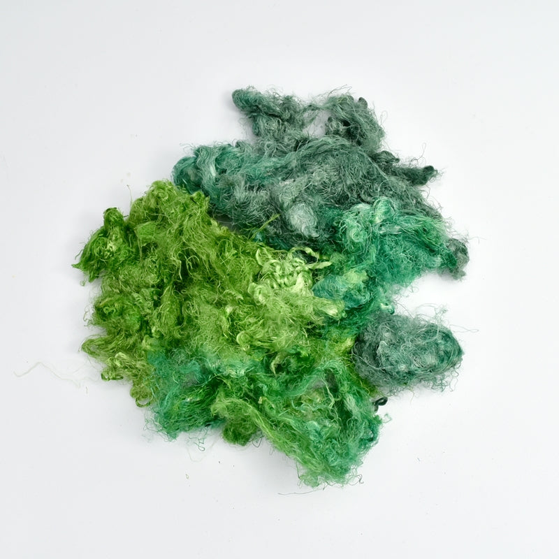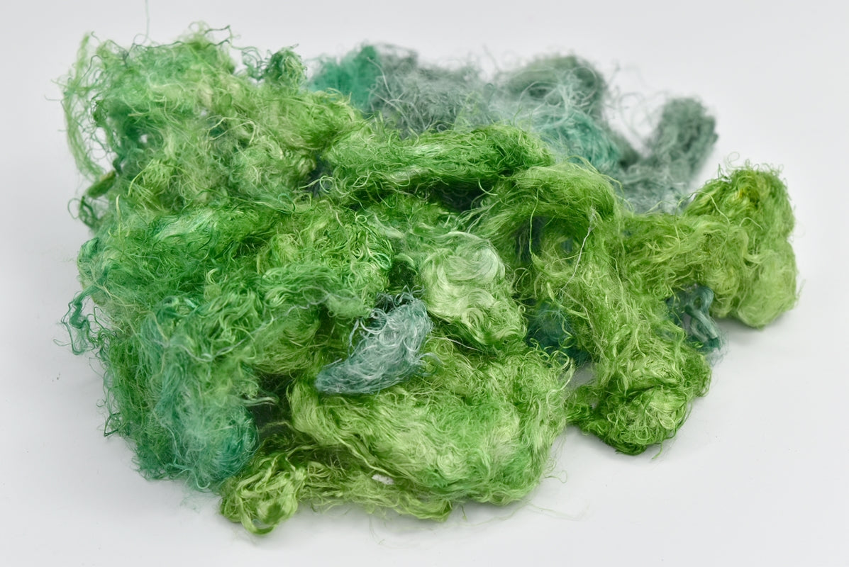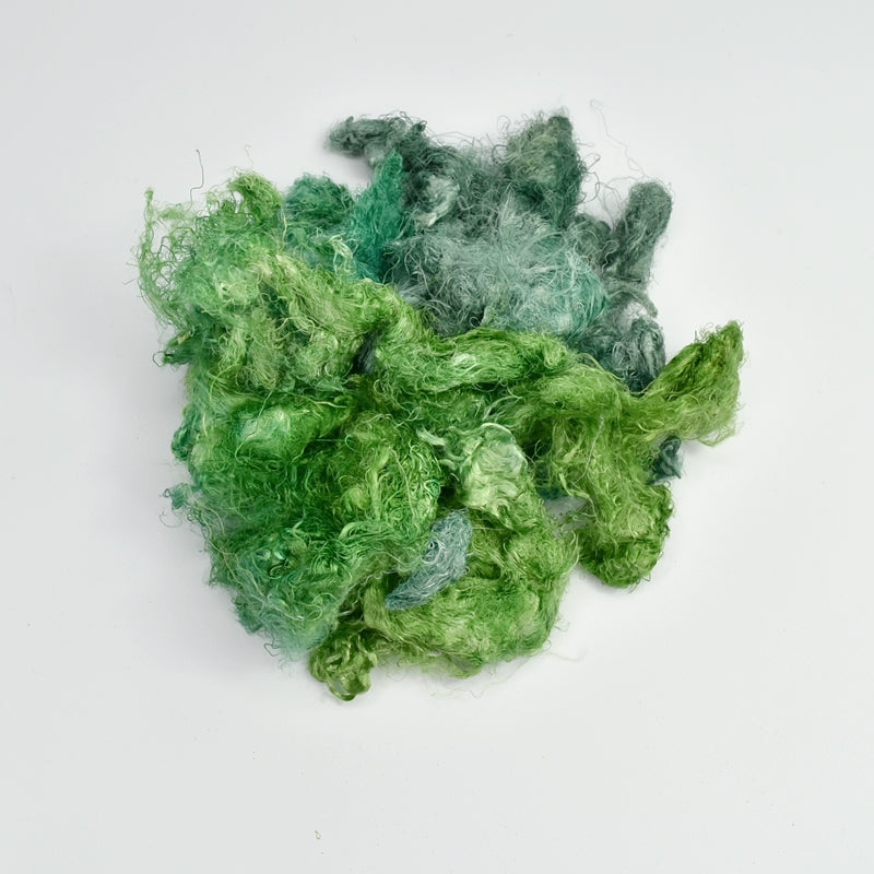 Mulberry Silk Throwster Waste Hand Dyed in a strong variegated green combination. Grasshopper has a number of different greens making up its colour mix.