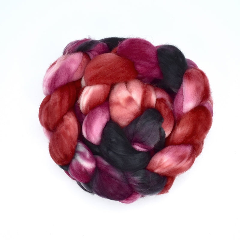 Velvet Rose is a colourway I have used across many of my fibres and yarns. It has a combination of crimson, red and black with lighter shaded areas.