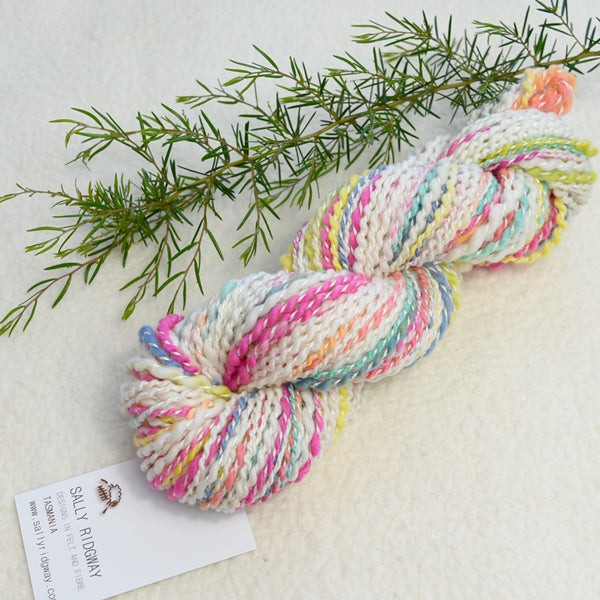 This light and pretty skein is created and designed using my undyed merino and with splashes of hand dyed Tassie superfine Merino blended through. I have plied it all together with a strong cotton yarn.
